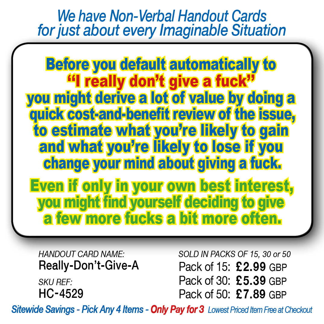 Our Handout Cards do exactly that on dozens of topics, most of them in ways that will have you laugh out loud. And being pre-printed, responsibility for having created the sometimes harsh or naughty words stays with us, not you!