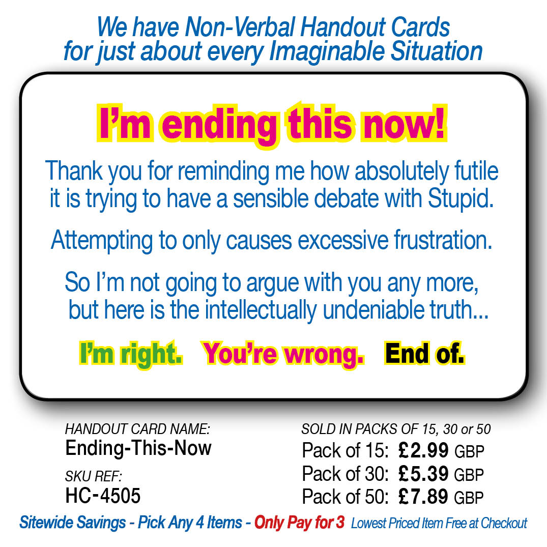 Our Handout Cards do exactly that on dozens of topics, most of them in ways that will have you laugh out loud. And being pre-printed, responsibility for having created the sometimes harsh or naughty words stays with us, not you!