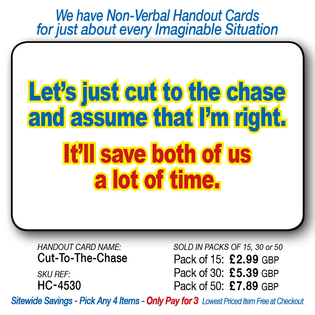 Our Handout Cards do exactly that on dozens of topics, most of them in ways that will have you laugh out loud. And being pre-printed, responsibility for having created the sometimes harsh or naughty words stays with us, not you!